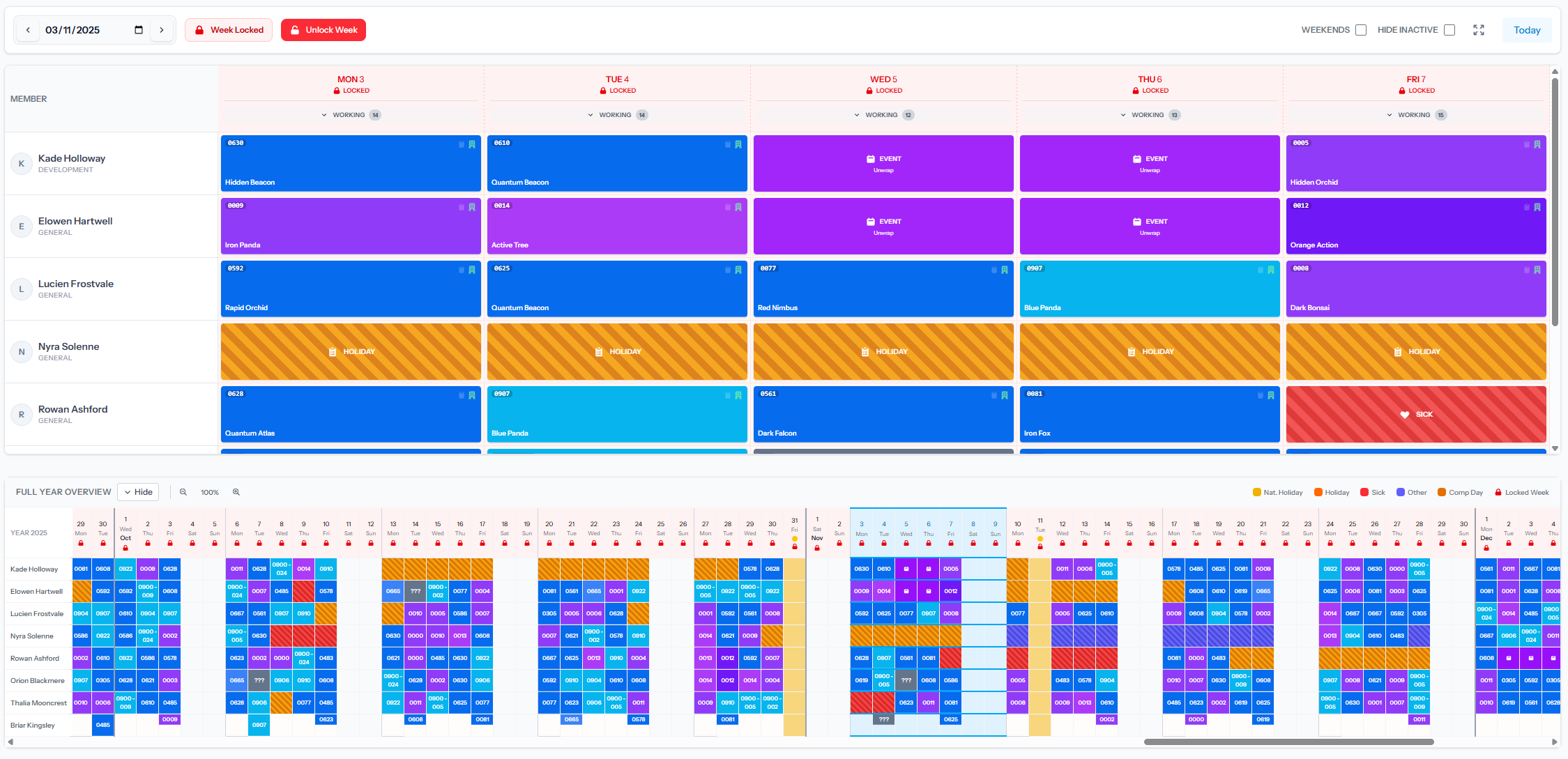 Visual grid with team member rows and day columns. Navigate by week with prev/next buttons or a date picker.